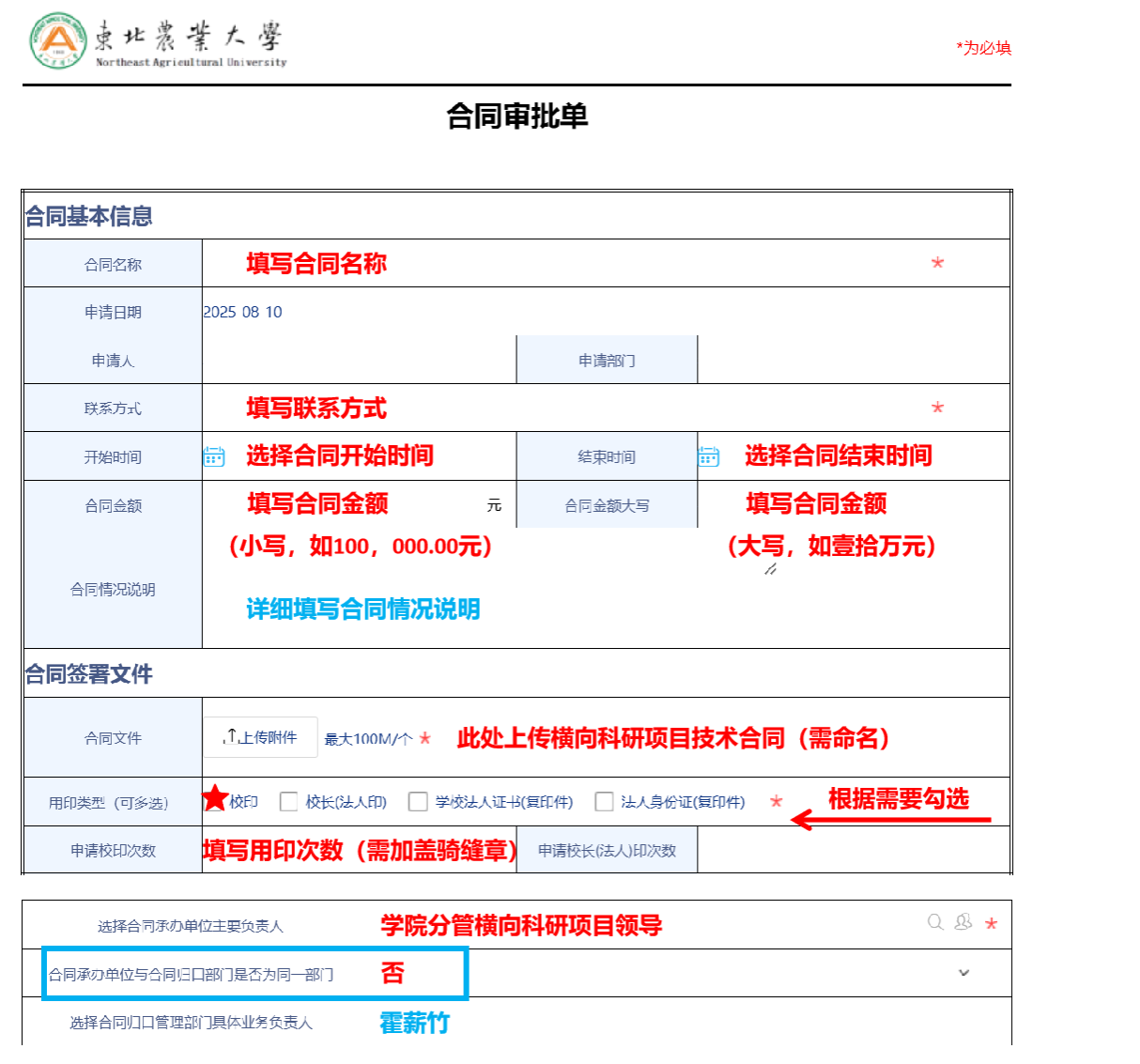 2.合同承办单位与合同归口部门是否为同一部门选择否;