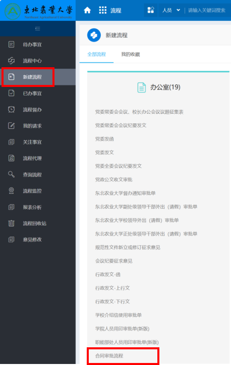 第三步:点击左侧“新建流程”--“合同审批流程”