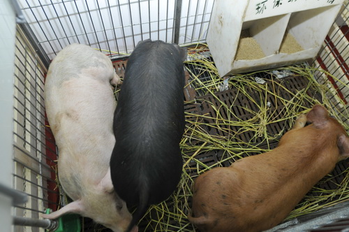 现场技术人员告诉她,这几只“三花猪”产自东北农业大学畜牧创新区健康养殖基地。“三花猪”是以我国优秀地方品种东北民猪为基础培育出来的杂优猪,因为毛色多为“红、黑、白”三色混合而得名。这种猪最大的特点是在养殖过程中采用了我校的福利饲养工艺,猪舍更大、不割猪尾、利用稻草等提高猪的运动量,这种创新性健康养殖模式,突出动物养殖福利理念,猪在养殖过程中实现了“心理健康+体质健康+环境健康”,是绿色安全健康营养的畜禽产品,猪肉具有“嫩、鲜、香”的特点,深受消费者欢迎。而林甸鸡是我省唯一入选《中国家禽品种志》的地方鸡种,因外来品种影响,一度濒临灭绝,后经我校大家禽课题组与省畜牧兽医局等部门研究合作,将林甸鸡这一优质鸡种成功保种,并根据市场需求开展了林甸鸡的育种工作。林甸鸡具有抗寒、耐粗饲、生活力强等优点,是适宜在我国东北高纬度寒冷地区饲养的鸡种,主要产地在黑龙江省林甸县,分布于产地邻近地区,现有饲养量约26万只。