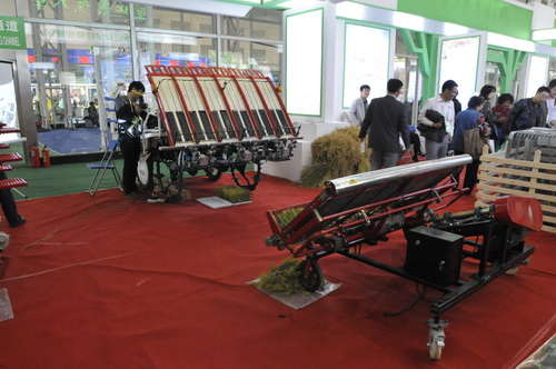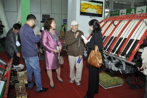 在这一展区,国际首创、具有国际领先水平的“水稻宽窄行移栽机”和“水稻钵苗移栽机”同样吸引了众多媒体的关注和农户的目光。来自五常的万亩水稻种植户、甘南县兴塔的水稻种植户以及丰泽合作社的负责人纷纷前来详细咨询两种机器的功能、特点、推广使用情况和价格。在看到现场播放的田间示范视频和现场技术人员的演示后,一位水稻种植户表示,“这台机器真挺好。钵苗移栽本身不用缓苗,带着营养土插秧移栽不伤根,省得以往插秧的时候拽苗撕根,没有缓苗期。我家有7垧地,每次插秧都得拽伤苗10%以上,也知道钵苗移栽好,但是自己手工栽钵苗真是劳动强度太大了,干不了,顾人费用高,300块钱一亩地都没人干。这回好了,机器能移栽,费用低、质量好,不到3万块钱,挺划算,明年我们家一定要买一台。”