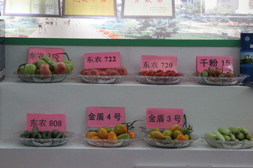 此外,我校园艺学院在该展区展示了26种我校绿色蔬菜生产基地种植的绿色、特色蔬菜;黑加仑等4种果树;东农715、东农722等6种我校培育的优质番茄;40多种花卉种籽以及果酱、果酒等4种蓝靛果深加工产品。农学院在该区展示了推广面积已超过200万亩的水稻优良品种东农428、改变了黑龙江省种植结构的“东农冬麦1号”和“东农冬麦2号”,并利用图片的形式重点介绍了我校大豆优质、高产、多抗分子聚合育种的研究及新品种选育与推广等技术成果和科研项目。