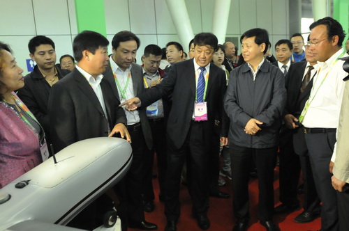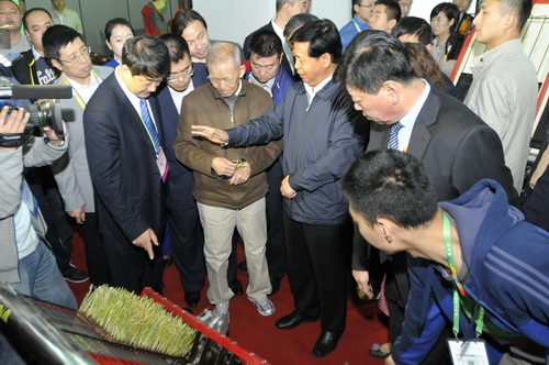 推介会后,省委、省政府及相关厅局的主要领导参观了位于会展体育中心A、B馆内的7大主题展区。省委书记王宪魁到位于B馆科技支撑展区的我校主题展区参观指导,我校党委书记冯晓、校长包军、副校长张长利、郑秋鹛热情接待并陪同参观。在“绿色安全种植业展区”, 王宪魁参观了展区内陈列的由我校电气与信息学院研发团队自主研发的固定翼无人机,冯晓介绍了无人机应用于农情综合监控体系的具体情况。工程院院士、我校工程学院农机专家蒋亦元为王宪魁介绍了水稻宽窄行插秧机的推广情况,并现场演示了水稻钵苗移栽机的使用。