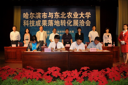 开幕式上,我校科技联络员代表与区县代表签约。我校“氮缓释多元玉米套餐肥研制及配套施肥技术推广项目”、“利用高效繁殖技术快速扩繁良种肉牛产业化项目”、“高凝胶稳定型大豆分离蛋白产业化项目”、“蓝靛果新品种苗木产业化开发项目”4项技术科技成果落地转化项目负责人与相关企事业单位签约,成功实现落地转化。