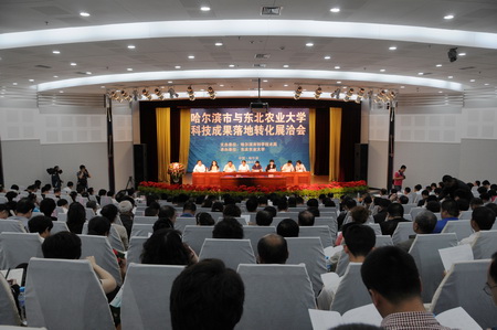 6月11日下午,由哈尔滨市科学技术局与我校联合举办的“哈尔滨市与东北农业大学科技成果落地转化展洽会”在我校隆重开幕。黑龙江省副省长程幼东,哈尔滨市副市长张显友,省教育厅厅长张永洲,省科技厅副厅长于立河,哈尔滨市科技局局长于沐琳、副局长李志杰等领导出席开幕式。我校党委书记、校长徐梅,副校长郑秋鹛,下派哈市的18名科技联络员,新农村发展研究院及相关学院、部门负责人、专家参加活动。哈尔滨市科技局、市农委、市畜牧兽医局等市直单位领导,哈市八区十县的区、县(市)长,科技、农业职能部门负责人,重点农业企业,农民协会,种养殖大户500多人参加开幕式。开幕式由哈尔滨市科技局局长于沐琳主持。