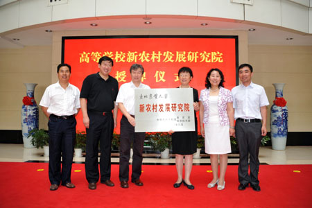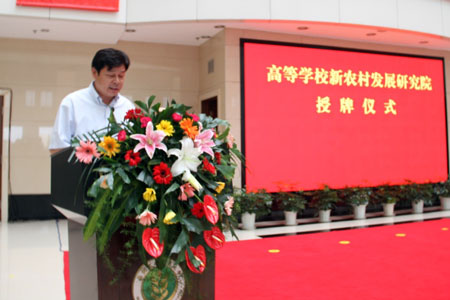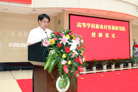 教育部副部长杜占元首先宣读《教育部、科技部关于同意中国农业大学等10所高校成立新农村发展研究院的通知》。随后,刘延东同志依次为中国农大、浙江大学、西北农林、东北农大、南京农大、华中农大、四川农大、沈阳农大、安徽农大和湖南农大十所院校授牌,并与各高校领导合影留念。