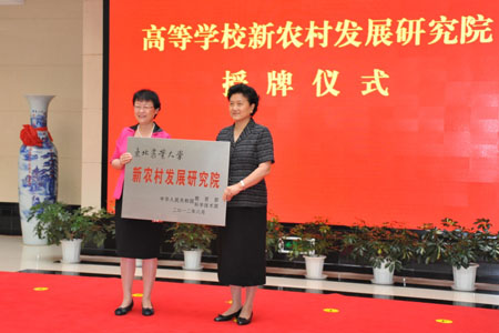 7月11日下午,由教育部、科技部主办的“高等学校新农村发展研究院授牌仪式”在陕西杨凌的西北农林科技大学举行。中共中央政治局委员、国务委员刘延东为中国农业大学、浙江大学、西北农林科技大学、东北农业大学等十所高校授牌。我校党委书记、校长徐梅代表学校从刘延东手里接过“东北农业大学新农村发展研究院”牌匾。仪式由科技部副部长张来武主持。教育部副部长杜占元、国务院农村综合改革工作领导小组办公室主任王卫星、陕西省委书记赵乐际,批准建设“新农村发展研究院”的十所高校主要领导等参加了授牌仪式。
