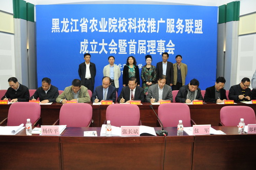 包军在会上致辞 在与会领导和嘉宾的见证下,11家联盟成员单位代表签订了“黑龙江省农业院校科技推广服务联盟协议书”。