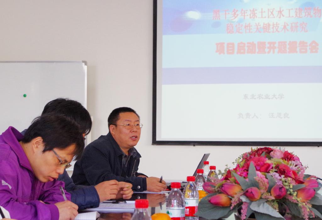 项目负责人,水利与建筑学院引进人才汪恩良教授介绍了国内外多年冻土领域研究现状,详细汇报了项目总体实施方案和七个子任务研究实施方案。
