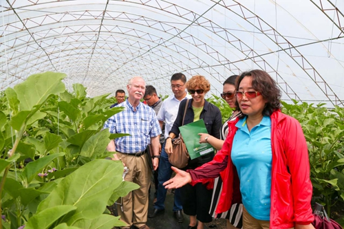 7月23日上午,路.斯万森博士一行在郑秋鹛副校长的陪同下,来到我校校外示范基地—“宾县永和蔬菜生产基地”,先后考察了棚室蔬菜种植区、露地蔬菜种植区和温室蔬菜种植区。郑秋鹛详细介绍了该基地的服务模式及运行情况,该基地是我省规模最大的蔬菜生产基地,通过“学校+企业”、“专家+基地技术员”的模式,校企建立了长期稳定的合作关系,技术服务内容从单一技术指导到全面技术支撑,目前基地的棚室改造、优良品种引进、栽培技术指导等技术服务全部由我校提供。