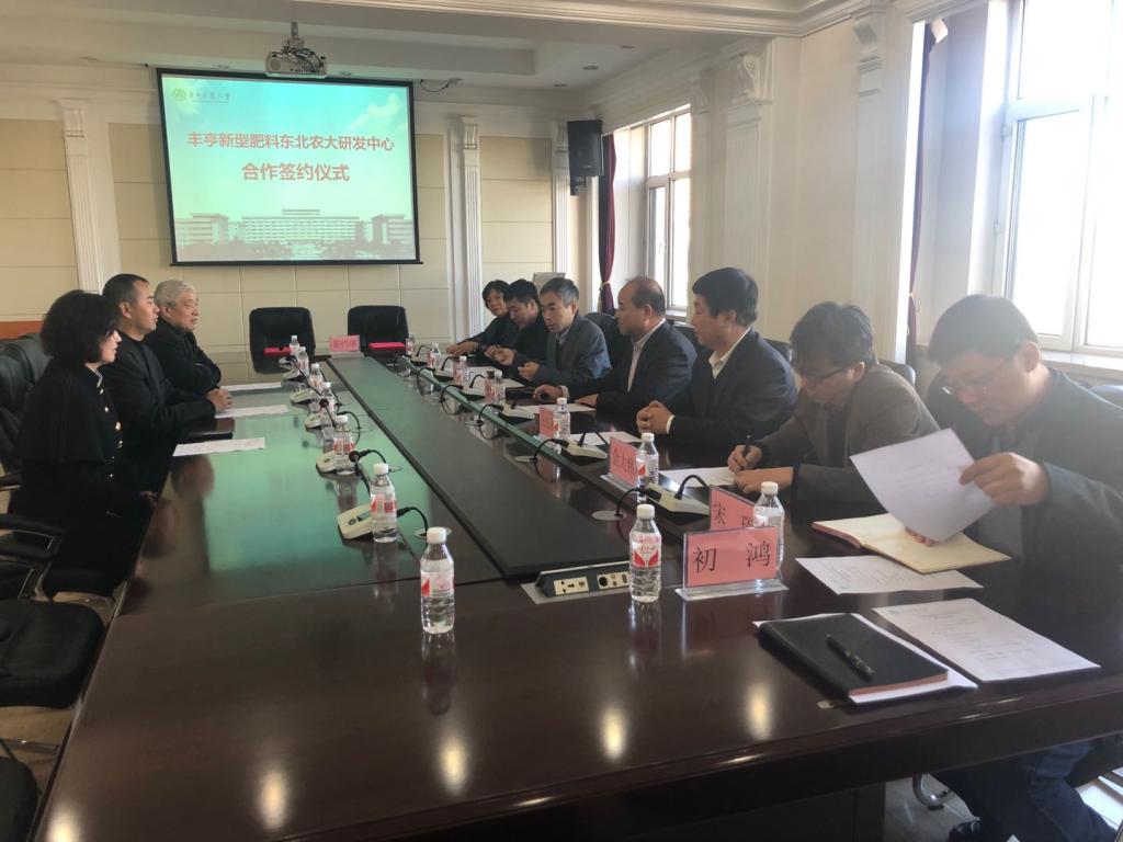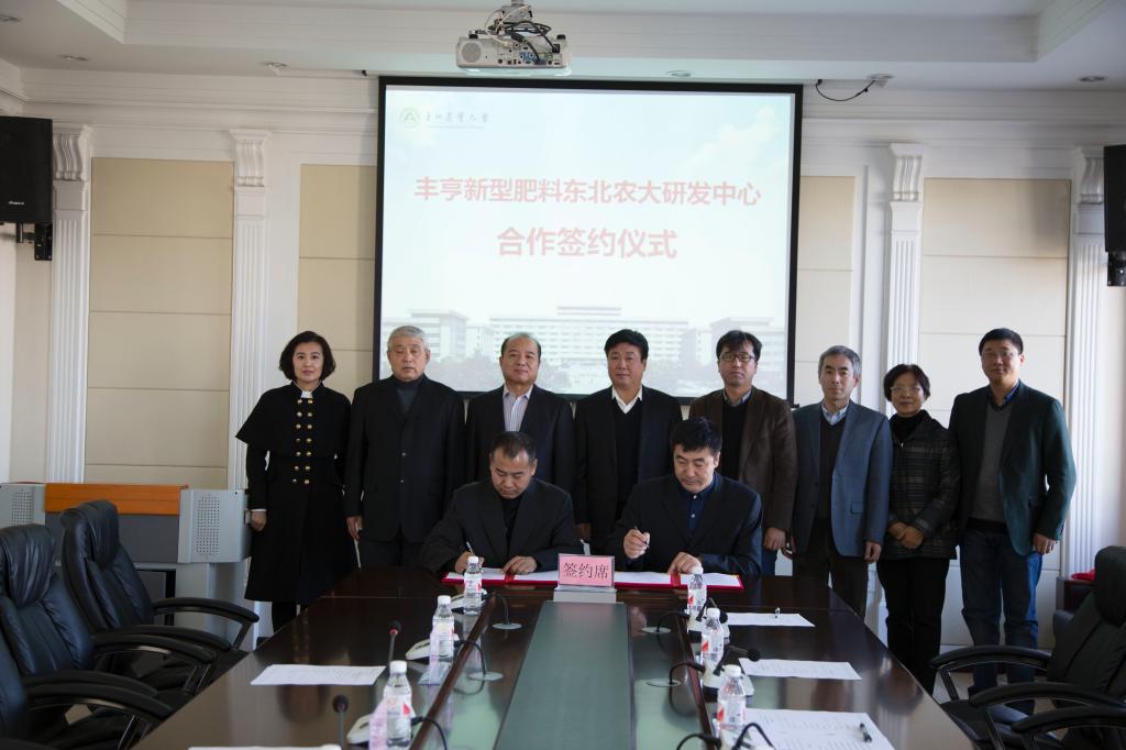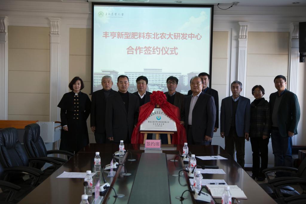 最后,姜佰文副院长和刘财立总经理分别代表东北农业大学和黑龙江省丰亨生物科技有限公司在“丰亨新型肥料东北农大研发中心”协议书上签字。邹德堂副校长和刘财立总经理在与会人员的见证下,共同为“丰亨新型肥料东北农大研发中心”揭牌。