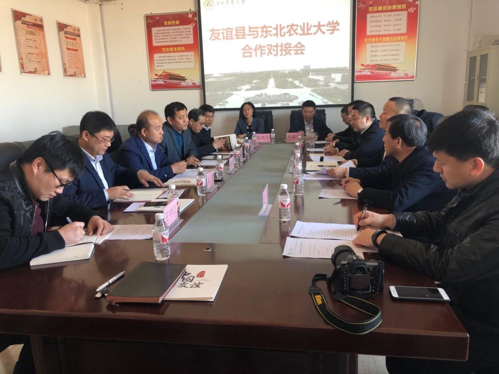 3月7日下午,友谊县县长蔡纯意、县委副书记刘任重等一行7人来我校就大豆、西香瓜等农副产品精深加工、绿色食品研发、县域文化旅游深层次开发等内容开展对接洽谈,座谈会在主楼722会议室举行。我校副校长邹德堂、新农村发展研究院院长朱志猛、副院长宋珲、食品学院食品发酵专家孙波、园艺园林学院规划设计专家符兴源、资源与环境学院规划设计专家邹铁安、食品学院大豆精深加工专家王中江等参加了对接会,会议由朱志猛主持。
