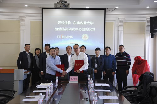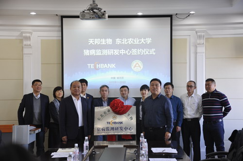 随后,李金龙和刘小兵分别代表双方在“东北农业大学天邦生物猪病监测研发中心”协议书上签字,邹德堂和王峰共同为“东北农业大学天邦生物猪病监测研发中心”揭牌。