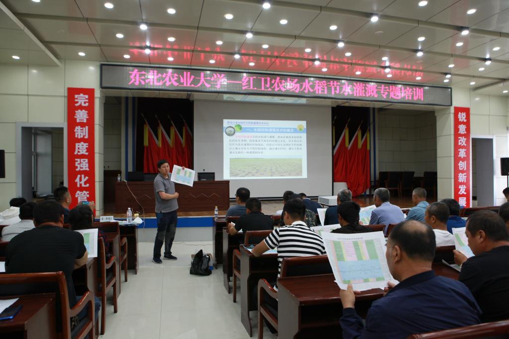 7月21日上午,工作组在红卫农场举办了水稻节水技术培训会。会议由红卫农场副场长隋喜友主持。农场农业技术员、水稻种植户近200人参加了培训会。与会人员共同观看了水稻节水控制灌溉技术培训片“细水润稻稻更俏”。李衡、张殿军分别从农业水价政策、水稻节水控制灌溉技术概念、优势、技术要点等方面,为稻农详细解读了“为什么要开展水稻节水”和“水稻生产中如何节水”两方面内容。两位专家语言朴实,理论结合实践,深受农民欢迎。会议期间,工作组向农民免费发放水稻节水控制灌溉技术手册、光盘及技术组合模式图近600份。