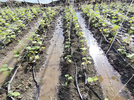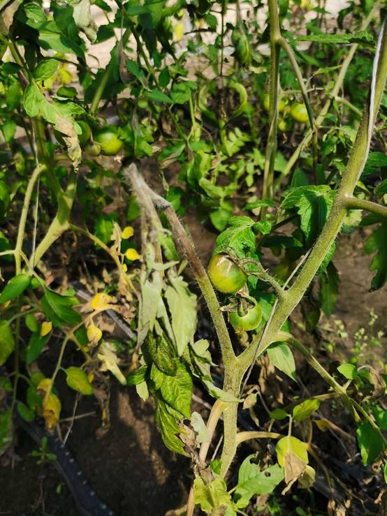 9月18日专家团再次来到工农村,由于低温多雨,对棚室蔬菜生产影响严重,目前温室内还有少量积水。8月份定植的黄瓜生长缓慢,叶色发黄,霜霉病严重;番茄虽然已经坐果,但有晚疫病发生,茎叶和果实均有侵染。专家组建议,尽快排除积水、大通风降湿、药剂防治,减少损失。