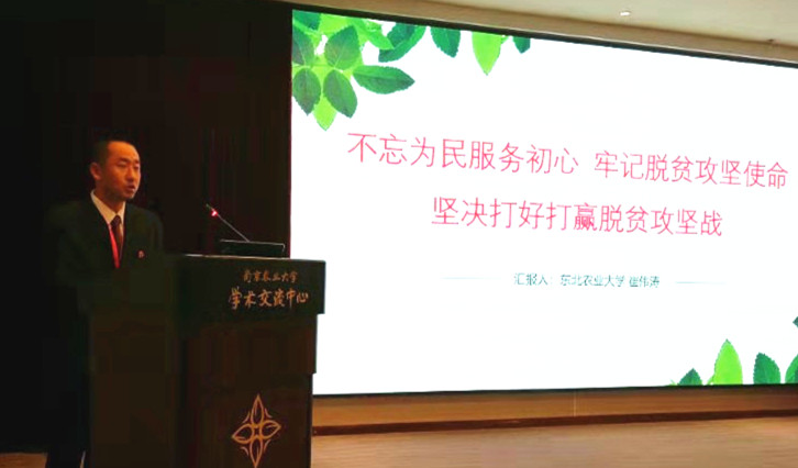 江苏省农业农村厅副厅长蔡恒、中国农业大学教授李小云分别作特邀报告。来自18所高等院校的代表就脱贫攻坚与乡村振兴典型案例作大会交流报告。崔伟涛代表学校作了题为《不忘为民服务初心,牢记脱贫攻坚使命,坚决打好打赢脱贫攻坚战》的脱贫攻坚典型案例交流发言。他从加强科技帮扶、实施致富产业项目,巩固脱贫攻坚成果、打赢脱贫攻坚战、实现乡村振兴战略的心得体会等方面分享脱贫攻坚经验,汇报了学校3年来主攻科技扶贫,发挥产学研优势,联动甘南县本土“生力军”,从科技成果,人才智力和社会服务等方面开展实施致富产业项目的典型案例。
