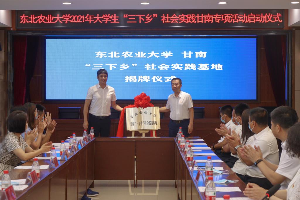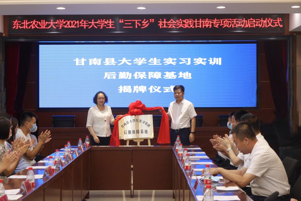 启动仪式上,丁泉宁与王秀丽共同为甘南县大学生实习实训后勤保障基地揭牌。李卡与马传东共同为东北农业大学甘南“三下乡”社会实践基地揭牌。