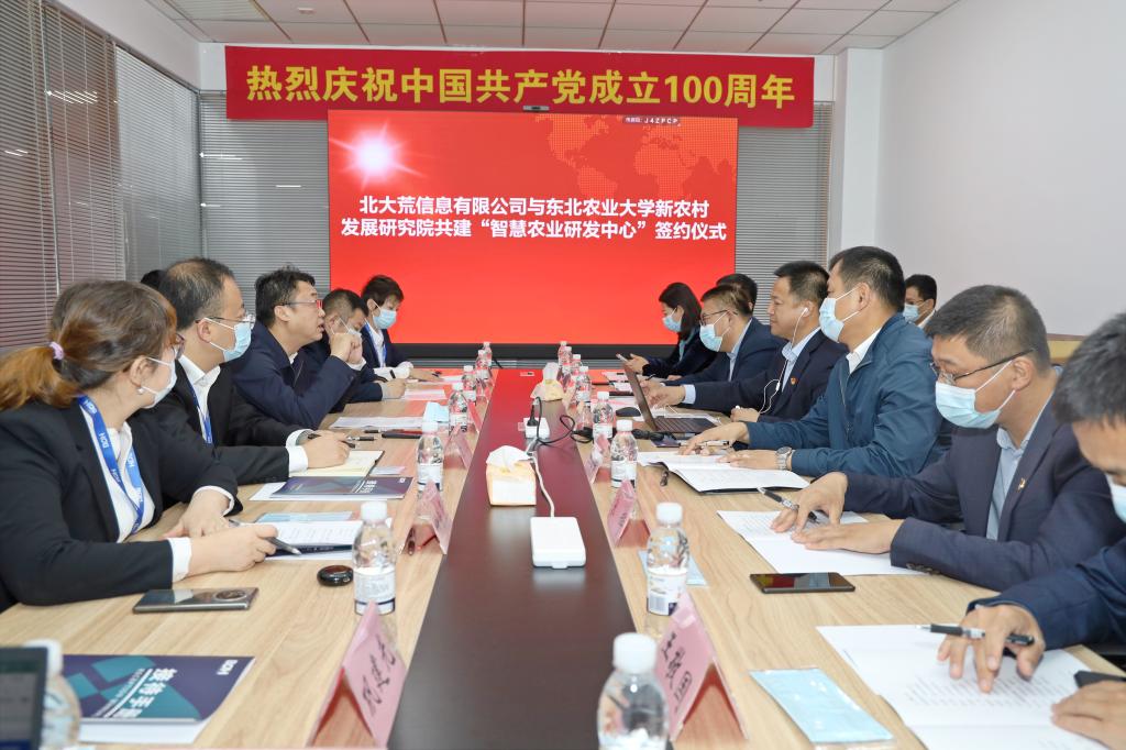 为扎实推动我校与北大荒信息有限公司智慧农业领域深度交流合作,同时推动研究生产学研教育培养,9月29日上午,我校赴北大荒信息有限公司共同举行“智慧农业研发中心”(以下简称“研发中心”)与“研究生联合培养基地”(以下简称“培养基地”)的签约授牌仪式。我校新农村发展研究院院长朱志猛、副院长宋珲,研究生院院长刘世英,农学院院长陈庆山、副院长王敬国、副院长张林、智慧农业系主任魏峭嵘及教师代表杨明亮和赵振庆等人参加会议;北大荒信息有限公司董事长张允海,副总经理兰天义、罗广超、任荣荣,纪委书记徐洪波,首席技术官巩建光参加会议。仪式由任荣荣主持。
