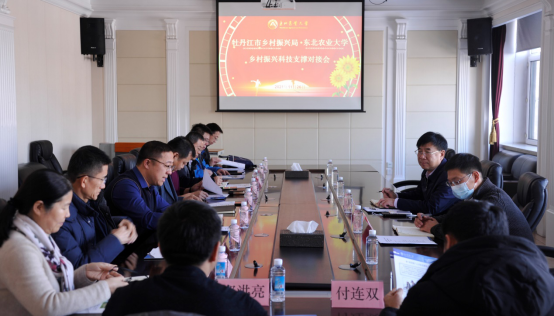 11月26日上午,牡丹江市乡村振兴局局长李志军、办公室副主任崔志刚一行来我校开展乡村振兴科技支撑合作对接工作,对接会在主楼610召开,新农村发展研究院院长朱志猛、副院长李其林,农学院院长陈庆山、副教授付连双、郑洪亮,园艺园林学院副院长秦栋、食品学院教授张秀玲、资源与环境学院教授许修宏、工程学院教授董守田、动物科学技术学院副教授宁方勇等领导及有关专家学者参加会议。会议由李其林主持。