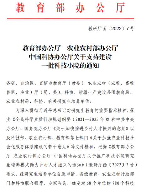 近日,教育部、农业农村部、中国科协联合下发《教育部办公厅农业农村部办公厅中国科协办公厅关于支持建设一批科技小院的通知》(教研厅函〔2022〕7号),我校黑龙江甘南大豆科技小院、黑龙江甘南小浆果科技小院、黑龙江红卫农场水稻科技小院等10个科技小院获支持建设。
