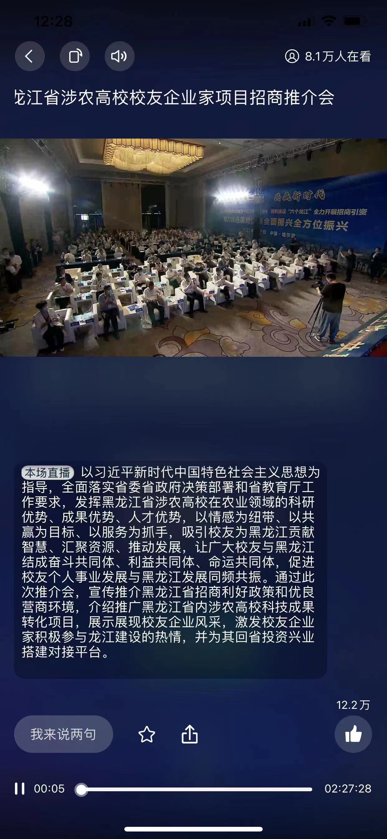 大北农集团董事局副主席张立忠、湖南安邦制药股份有限公司总经理徐建成代表校友企业家发言。他们表示,将不忘母校培养,动员更多企业家回龙江考察投资兴业,相信在省委省政府的正确领导下,在省高校校友企业家项目招商工作专班和母校的悉心指导下,天下龙江校友企业家将同心协力,同频共振,为家乡振兴做出更大的贡献。
