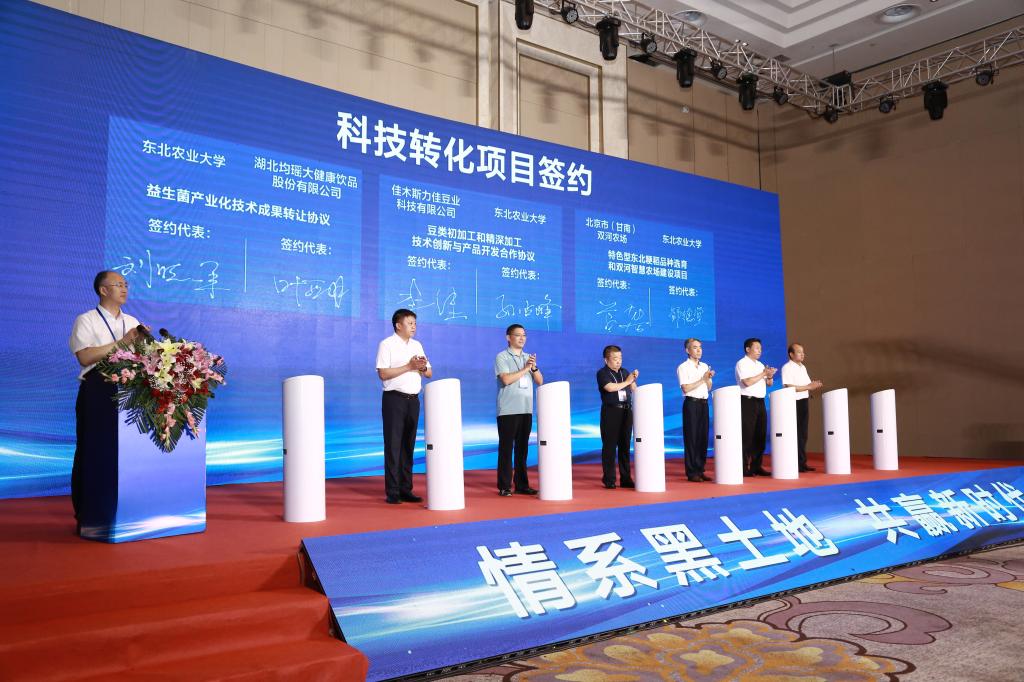 有关部门、企业举行了签约仪式,其中,地方与企业合作项目4个、战略合作项目7个、科技成果转化项目5个,涉及金额6.6亿元。我校副校长邹德堂、孙占峰、刘晓峰作为项目签约人对佳木斯市人民政府-东北农业大学合作共建、东北农业大学-深圳华大基因科技有限公司战略合作、哈尔滨经济技术开发区-东北农业大学战略合作、中国龙江森林工业集团有限公司-东北农业大学企校战略合作、豆类初加工和精深加工技术创新与产品开发合作、特色型东北粳稻品种选育和双河智慧农场建设项目、益生菌产业化技术成果转让、共建佳木斯市国家级数字农业先导区合作、生物菌剂转化合作等9个项目进行现场签约。