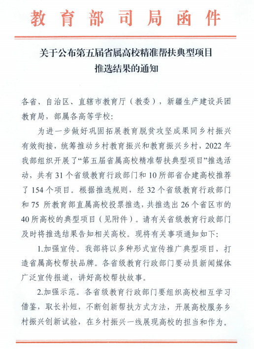 日前,在教育部组织的第五届省属高校精准帮扶典型项目评选中,我校精准帮扶黑龙江省甘南县工作项目《组合发力摒除穷根科技赋能乡村振兴》成功入选并获经费支持。