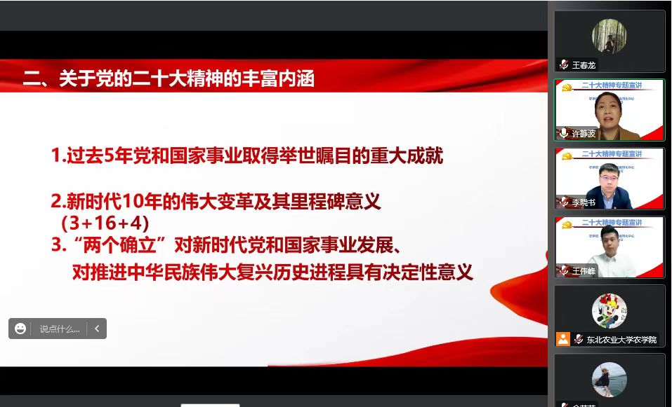为进一步深入学习贯彻党的二十大精神,切实把全院师生的思想统一到党的二十大精神上来,11月30日,农学院党委和社会合作与成果转化中心(新农村发展研究院)党总支共同召开学习贯彻党的二十大精神专题宣讲报告会。会议邀请马克思主义学院院长许静波教授作专题宣讲报告。农学院和社会合作与成果转化中心(新农村发展研究院)全体教职员工参会。报告会农学院党委书记李晓书主持。