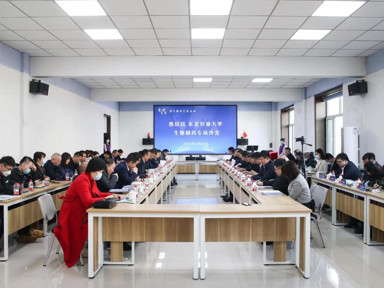 3月28日上午,香坊区委书记李亚飞,副书记、区长黄晓伟,人大常委会主任、党组书记吕战生,区委常委、常务副区长张磊,人大常委会副主任杨晶,市发改委、市科技局、市工信局有关领导和12家有关生物制药企业代表一行40余人到我校开展“香坊区‘深化服务代表企业’活动·生物制药专场”沙龙活动,就推动科技成果转化落地、促进校企合作等事宜进行深入对接。我校党委书记李长生、副校长刘竹青,生命科学学院院长武小霞,社会合作与成果转化中心(新农村发展研究院)党总支书记王伟峰、主任(院长)朱志猛,招生就业处副处长吴立龙、动物医学学院副院长李巍、植物保护学院教授向文胜等参加活动。活动由李亚飞主持。
