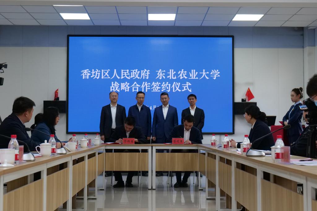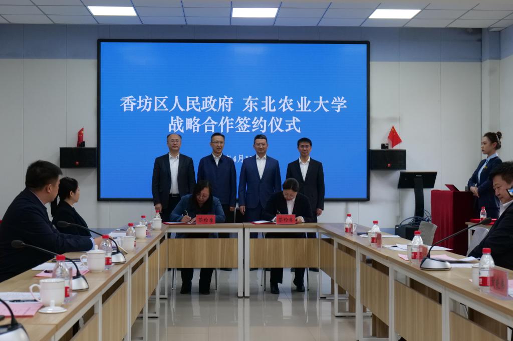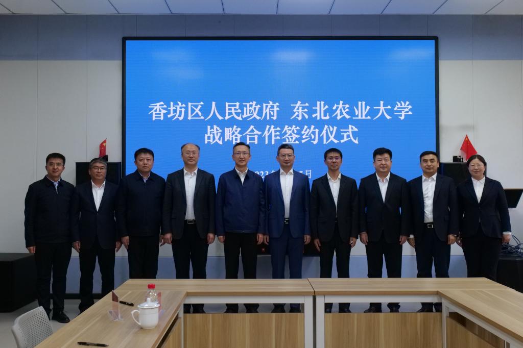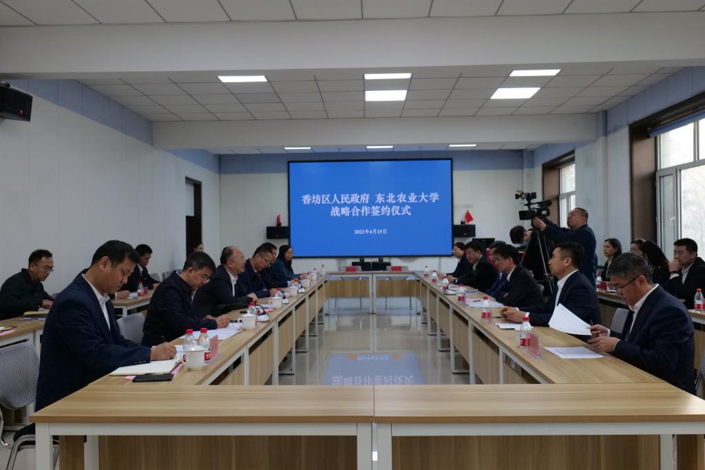 为深入贯彻落实党的二十大精神,进一步加强香坊区人民政府与东北农业大学政产学研用深入合作,推动东北农业大学国家“双一流”高校建设和香坊区经济社会高质量发展,4月15日,香坊区区委书记李亚飞、区长黄晓伟、常务副区长张磊、组织部部长杨铁岩、宣传部部长刘莉、副区长邹永刚及区人社局、教育局相关部门负责人一行16人,来学校签署区校战略合作及相关领域具体合作协议。校党委书记李长生、校长付强,副校长刘晓峰、刘竹青,学校相关处室和学院负责人参加签约仪式。会议由刘竹青主持。