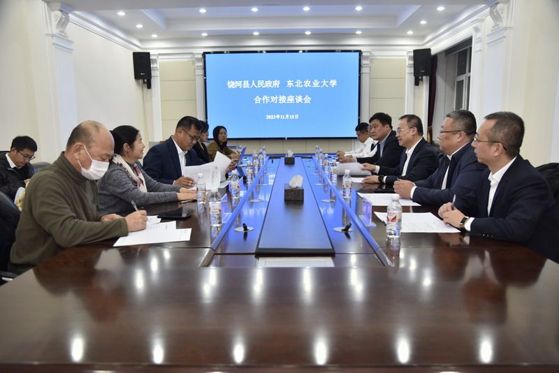 为贯彻落实党的二十大报告提出的“加快建设农业强国,扎实推动乡村产业、人才、文化、生态、组织振兴”的重要指示精神,强化校地深度务实合作,11月15日,饶河县人民政府县长付殿军、县委宣传部部长张苏、副县长冯健、政府办主任倪伟、农业农村局局长张伟东、电商办主任滕华军一行6人来我校开展合作对接。社会合作与成果转化中心(新农村发展研究院)主任(院长)朱志猛、食品学院教授张秀玲、食品学院教授夏秀芳、动物科学技术学院副教授尹海富、园艺园林学院讲师程瑶参加了座谈会。会议由朱志猛主持。