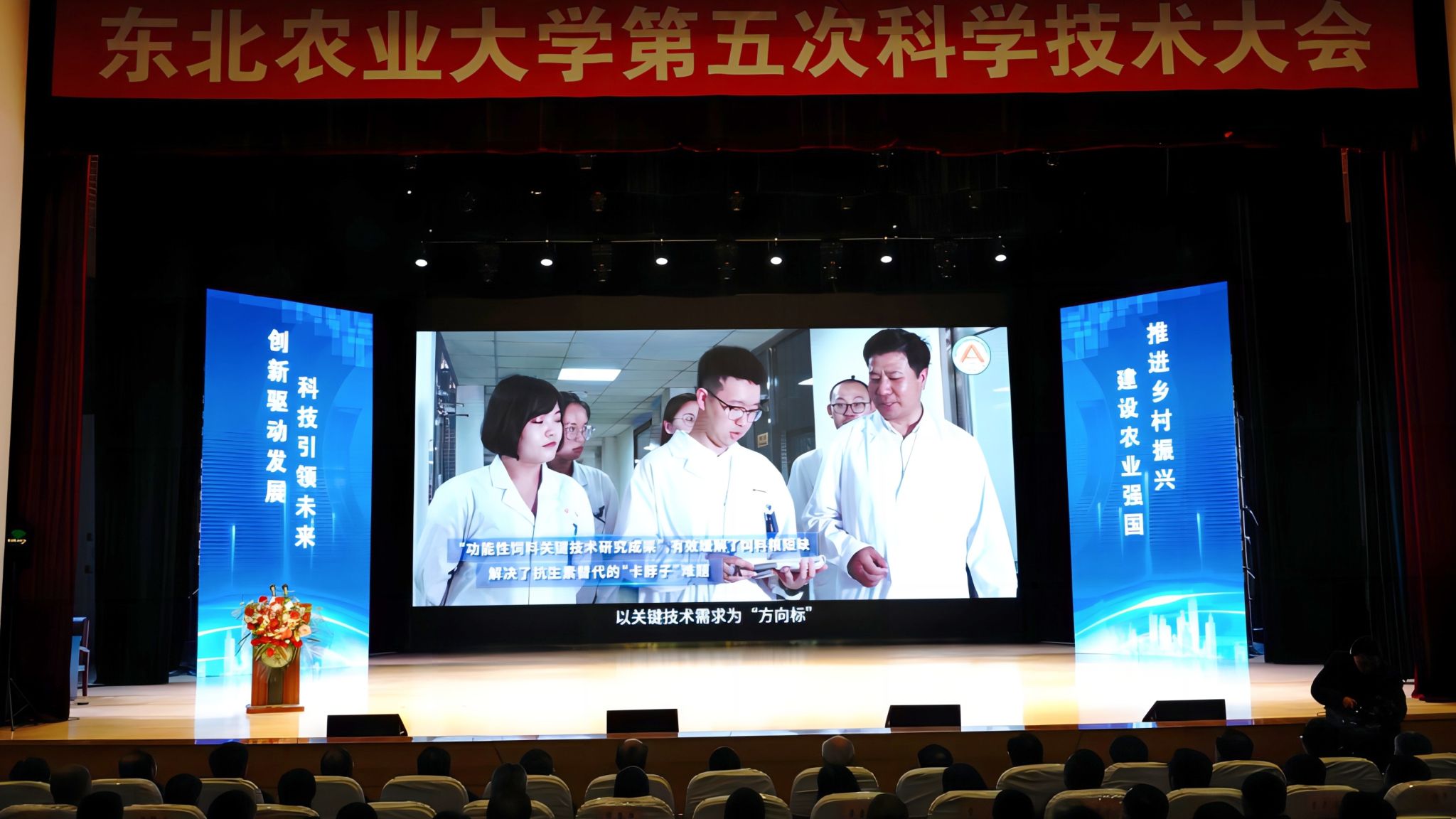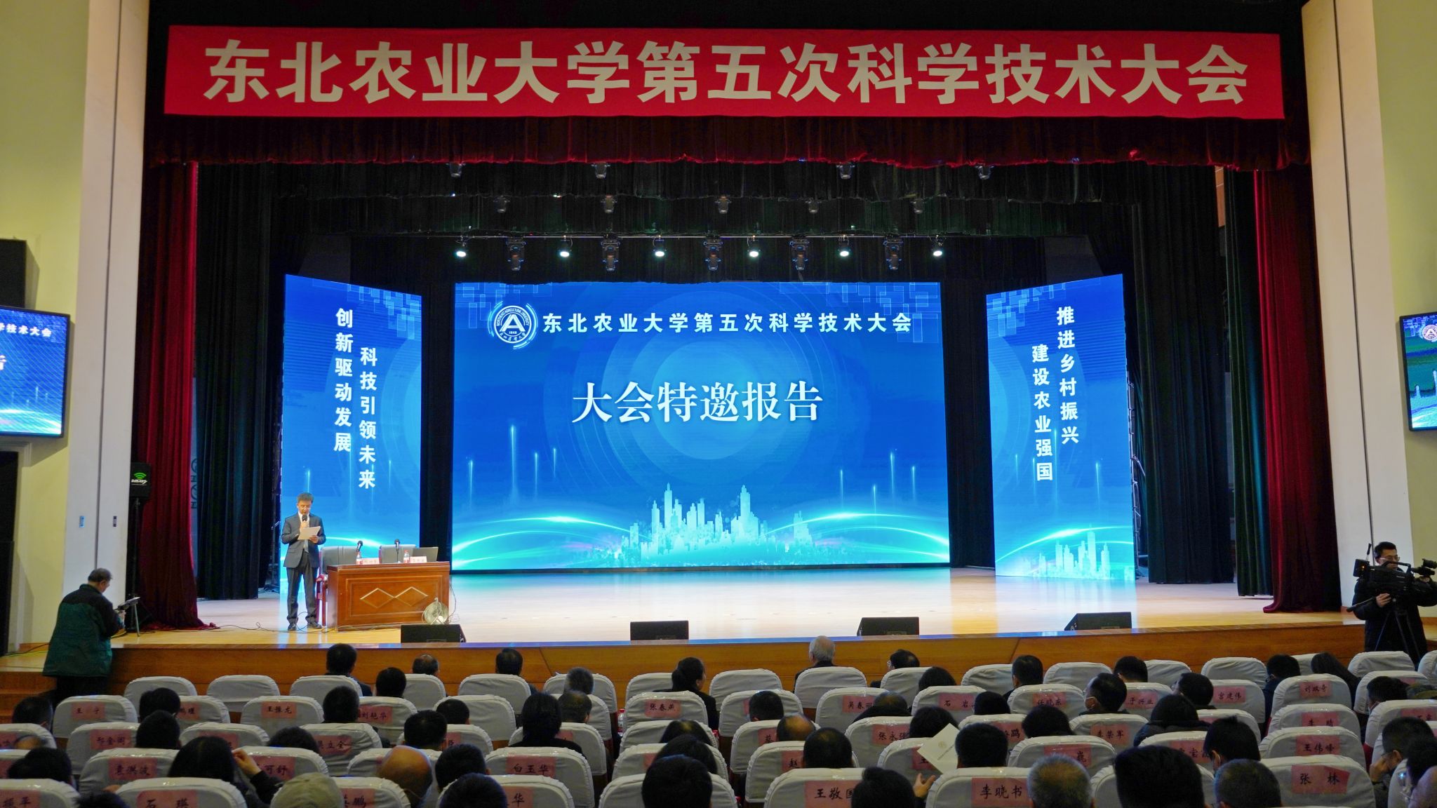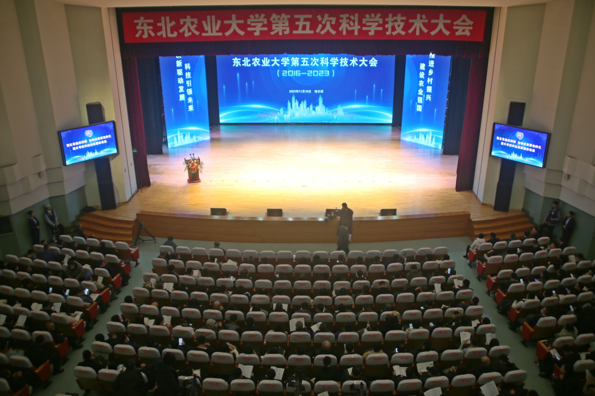 11 月 18 日,东北农业大学第五次科学技术大会在音乐厅隆重召开。会议以“强化有组织科研,加快成果落地转化,提升学校科技创新整体效能”为主题,回顾总结了“十三五”以来学校科技创新工作取得的成效和经验,发布表彰了一批代表性成果,谋划部署未来一个时期学校科技工作重点任务。中国工程院院士、中国农业大学教授李德发,教育部科学技术与信息化司原司长、中国产学研合作促进会副会长 雷朝滋,省科学技术厅厅长陈苏、省教育厅副厅长冯伟泉、省农业农村厅二级巡视员顾毅、人民日报社黑龙江分社社长崔佳、省直厅局业务主管处室领导等应邀出席会议,学校党委书记李长生,校长付强,党委副书记王泽方、贺景平,副校长李伟凯、孙占峰、刘竹青、刘晓峰,省绿色食品科学研究院党委书记、院长高放,校学术委员会委员及各专门委员会委员、学院教授委员会委员、二级岗教授、全校副处级以上干部,各学科团队带头人、国家和省部级平台负责人、重点科研项目负责人、科研秘书和科技管理干部、老科协专家代表、各学院教师、博士后,以及优秀研究生和本科生代表1000余人参加会议。会议开幕式由刘竹青主持。