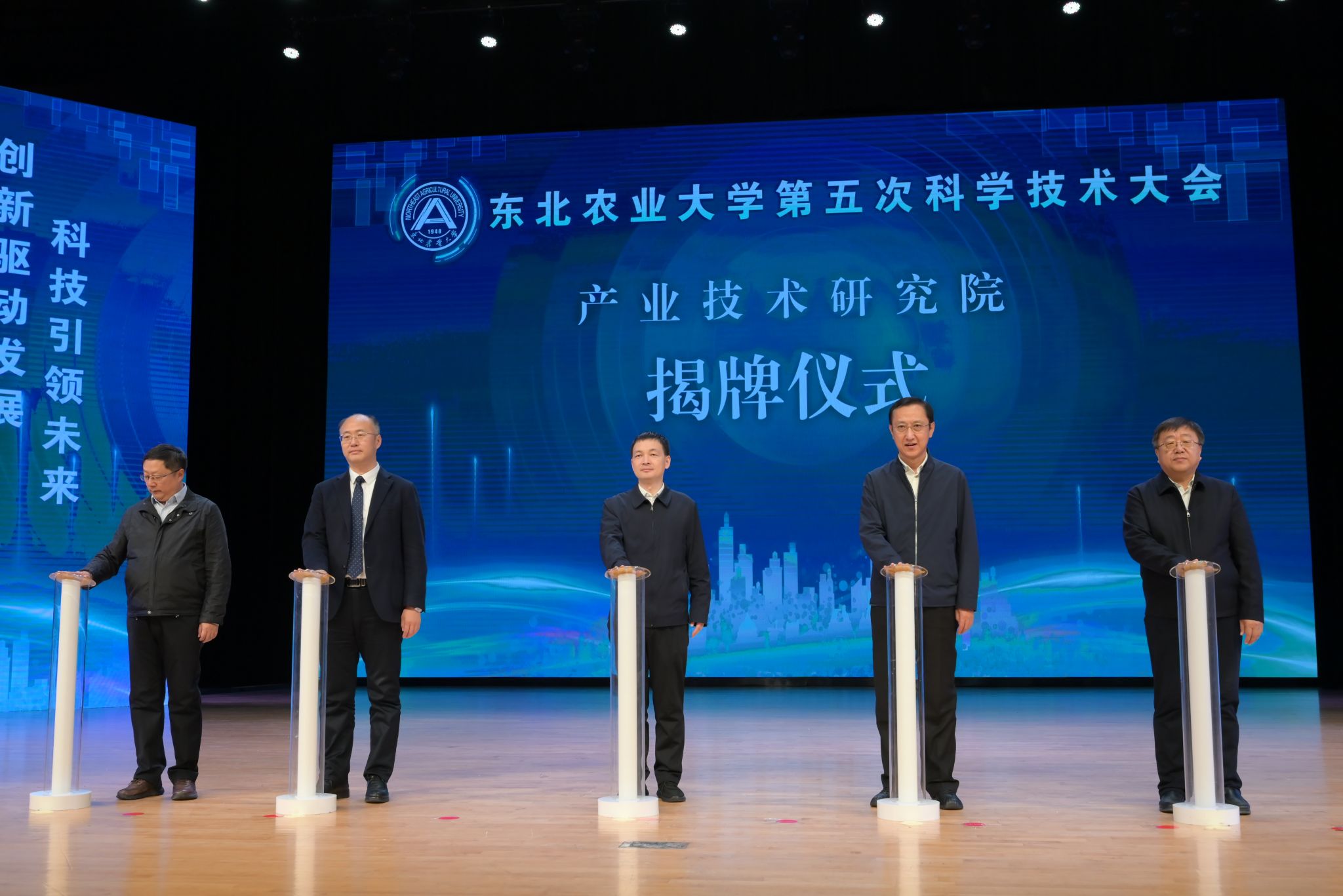 陈苏、李长生、付强、冯伟泉、顾毅共同为东北农业大学产业技术研究院揭牌。同时,举行东北农业大学科研创新服务平台启用仪式。