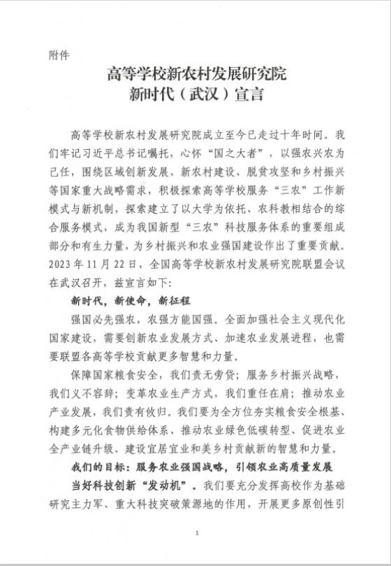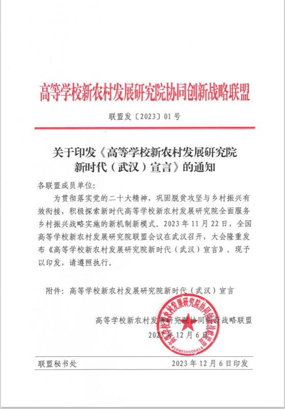 联盟印发《高等学校新农村发展研究院新时代(武汉)宣言》