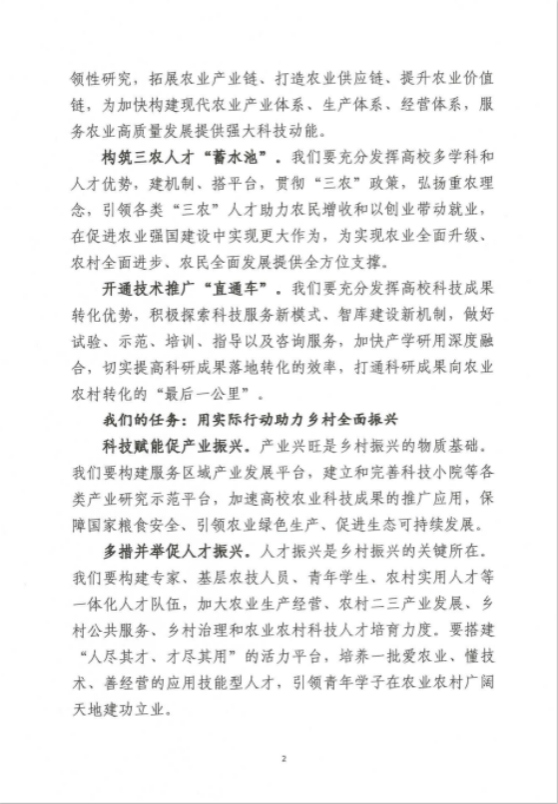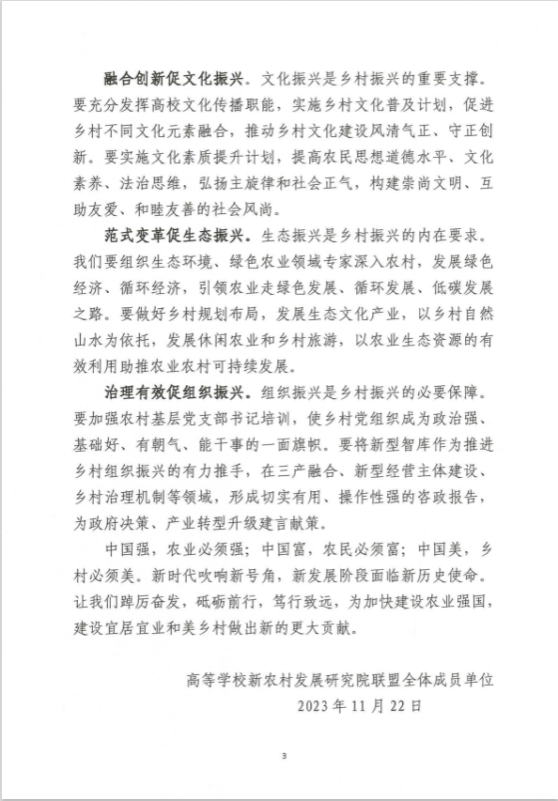 《宣言》确定了新时代高等学校新农村发展研究院的任务,通过科技赋能促产业振兴、多措并举促人才振兴、融合创新促文化振兴、范式变革促生态振兴、治理有效促组织振兴,“用实际行动助力乡村全面振兴”。