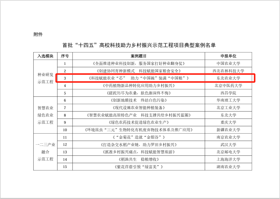东北农业大学《科技赋能农业“芯”助力“中国碗”装满“中国粮”》获评首批“十四五”高校科技助力乡村振兴种业研发示范工程5个典型案例之一,成为黑龙江省高校唯一入选案例。