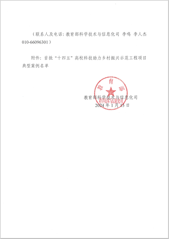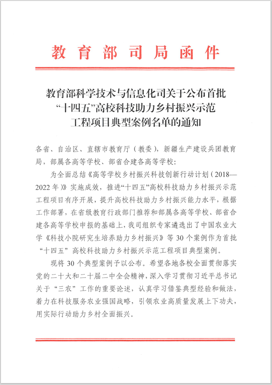 1月15日,《教育部科学技术与信息化司关于公布首批“十四五”高校科技助力乡村振兴示范工程典型案例名单的通知》发布。为全面总结《高等学校乡村振兴科技创新行动计划(2018——2022年)》实施成效,推进“十四五”高校科技助力乡村振兴示范工程项目有序开展,提升高校科技助力乡村振兴能力水平,教育部科学技术与信息化司在各省级教育行政部门推荐和部属各高等学校、部省合建各高等学校申报的基础上,组织专家遴选出30个案例作为首批“十四五”高校科技助力乡村振兴示范工程项目典型案例。