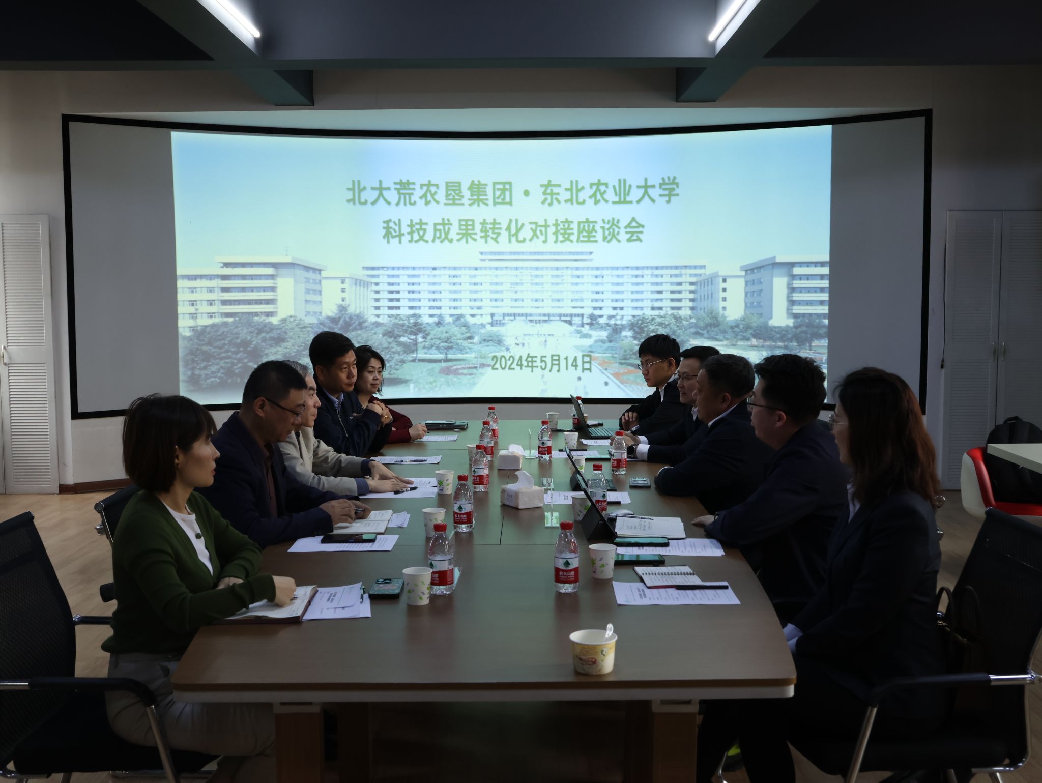 5月14日,北大荒农垦集团—东北农业大学科技成果转化对接座谈会在东北农业大学举行。北大荒农垦集团北京分公司党委委员、北大荒研究院执行院长闫凤超,北大荒农垦集团北京分公司党委委员、副总经理吴伟宗,北大荒农垦集团北京分公司党委委员、北大荒投资控股有限公司党委书记、董事长周雷,东北农业大学副校长孙占峰,社会合作与成果转化中心(新农村发展研究院)党总支书记王伟峰,副主任(副院长)宋珲出席座谈会。北大荒研究院研发部、项目部负责人,社会合作与成果转化中心(新农村发展研究院)校企合作科、成果转化科等相关人员参加会议。会议在学校大学科技园219室举行。