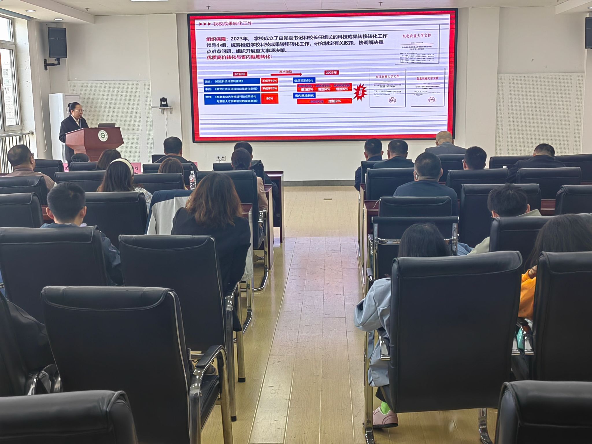 成果转化科负责人王晓雪介绍成果转化概述、我校的成果转化工作和全年工作重点,并详细讲解国家和我省的成果转化相关政策、我校成果转化基本情况、奖励政策、操作流程。