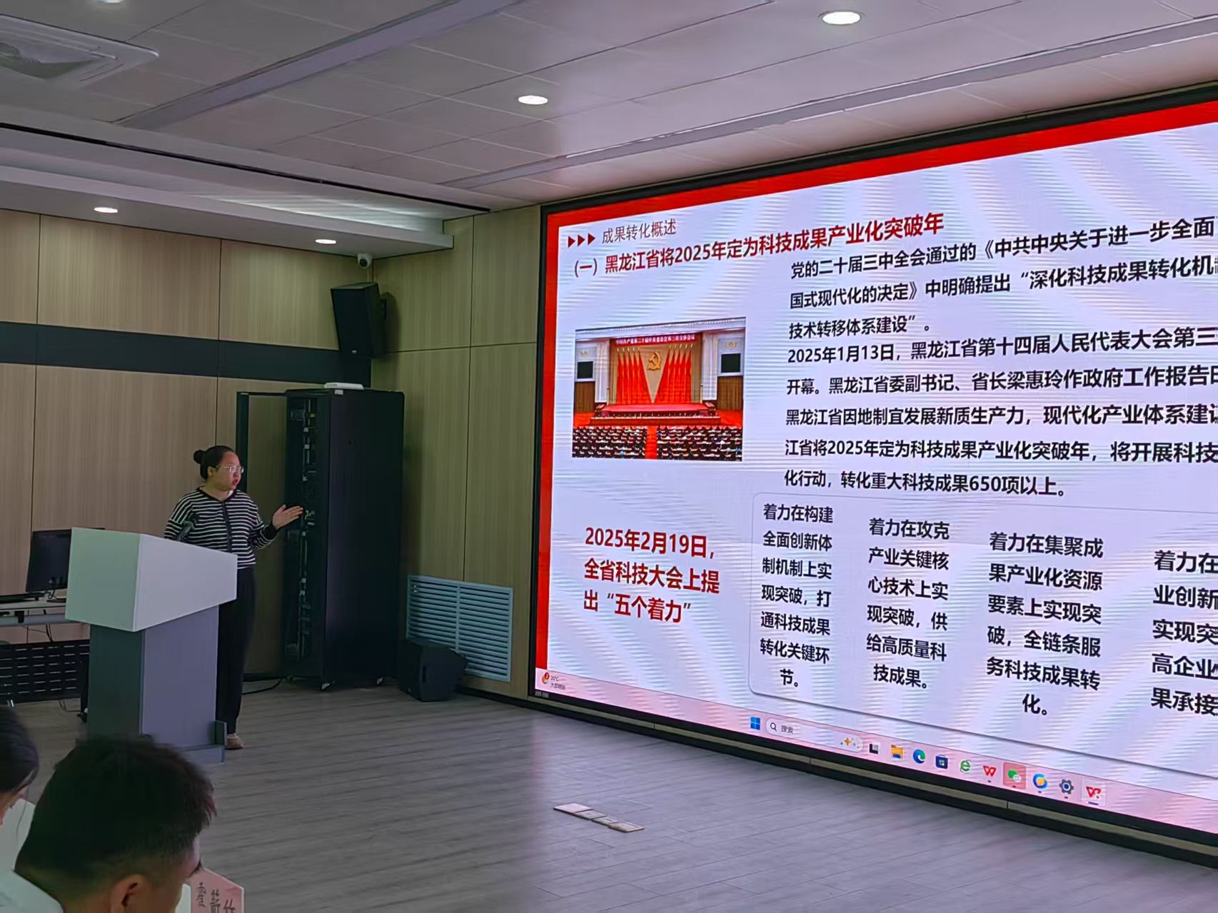 王晓雪介绍我校科技成果转化工作情况、赋权+转化、科技成果展示和推介、组织和制度保障、考核奖励、“待转化成果信息库、企业技术需求信息库、专家信息库”建设情况和下步工作重点。