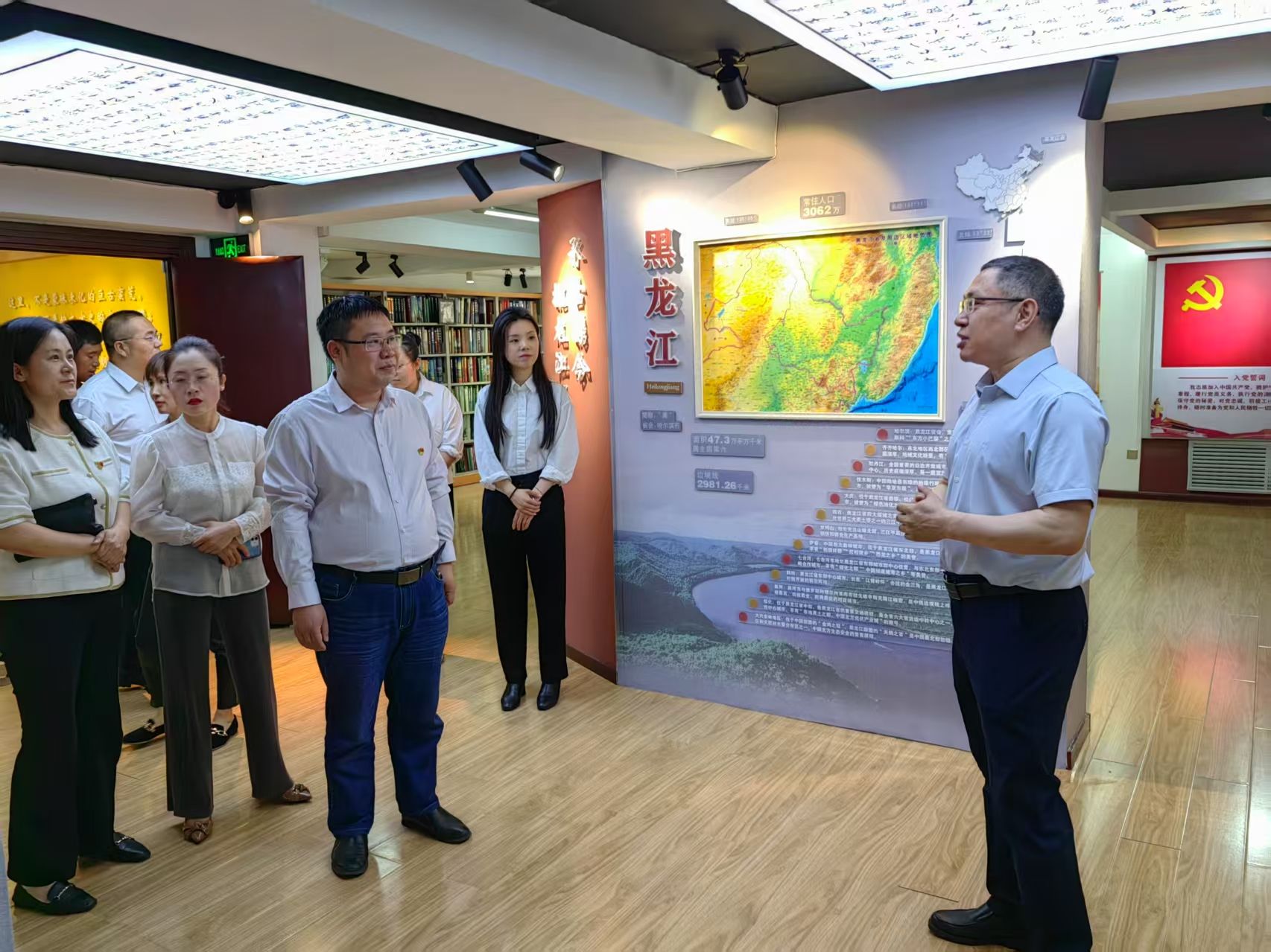 在史志龙江展馆参观过程中,黑龙江省委史志研究室省情信息处处长房波向社会合作与成果转化中心(新农村发展研究院)副主任(副院长)常敬礼一行讲解介绍黑龙江的历史渊源、世居民族、多元文化、自然资源、历史事件、发展成就和光辉历程,并重点介绍了建国以来的黑龙江农业发展史,讲述龙江人民在中国共产党领导下革命、建设、改革发展的奋斗历程和辉煌成就。