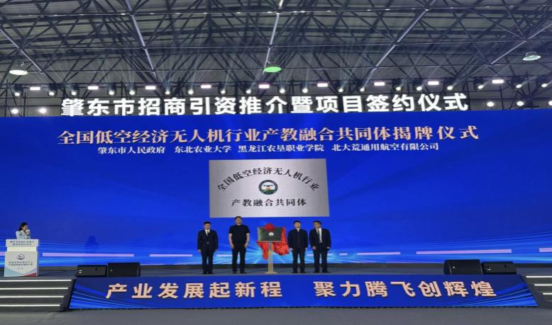 签约仪式上举行了“全国低空经济无人机行业产教融合共同体”的揭牌仪式。肇东市副市长刘闯、黑龙江农垦职业学院校长刘玉峰、北大荒通用航空公司党委书记刘国驰与孙世钧一同登台参加揭牌。