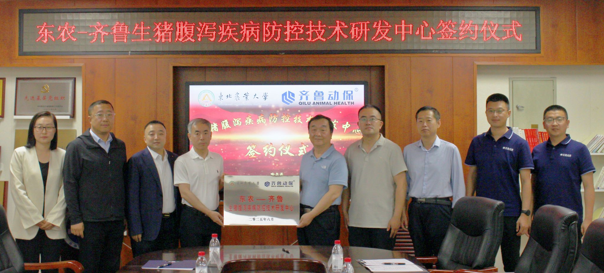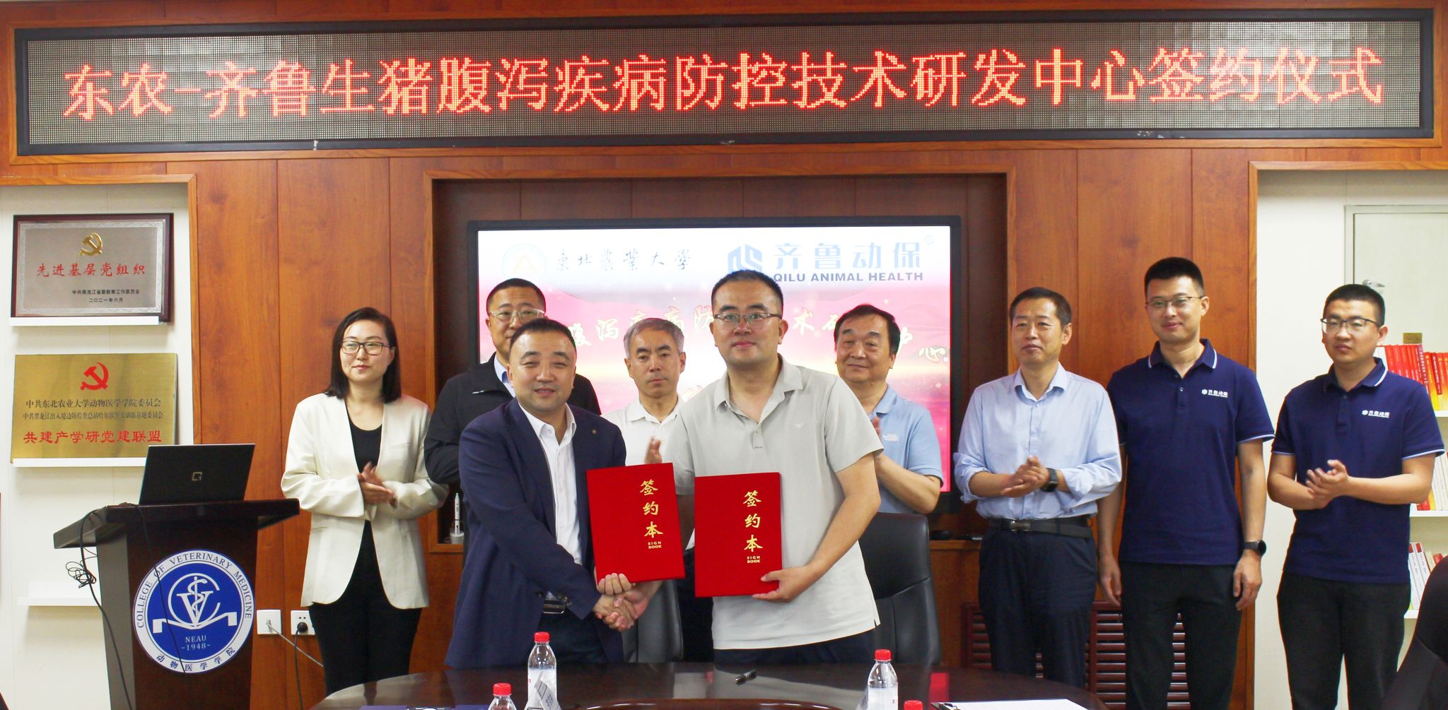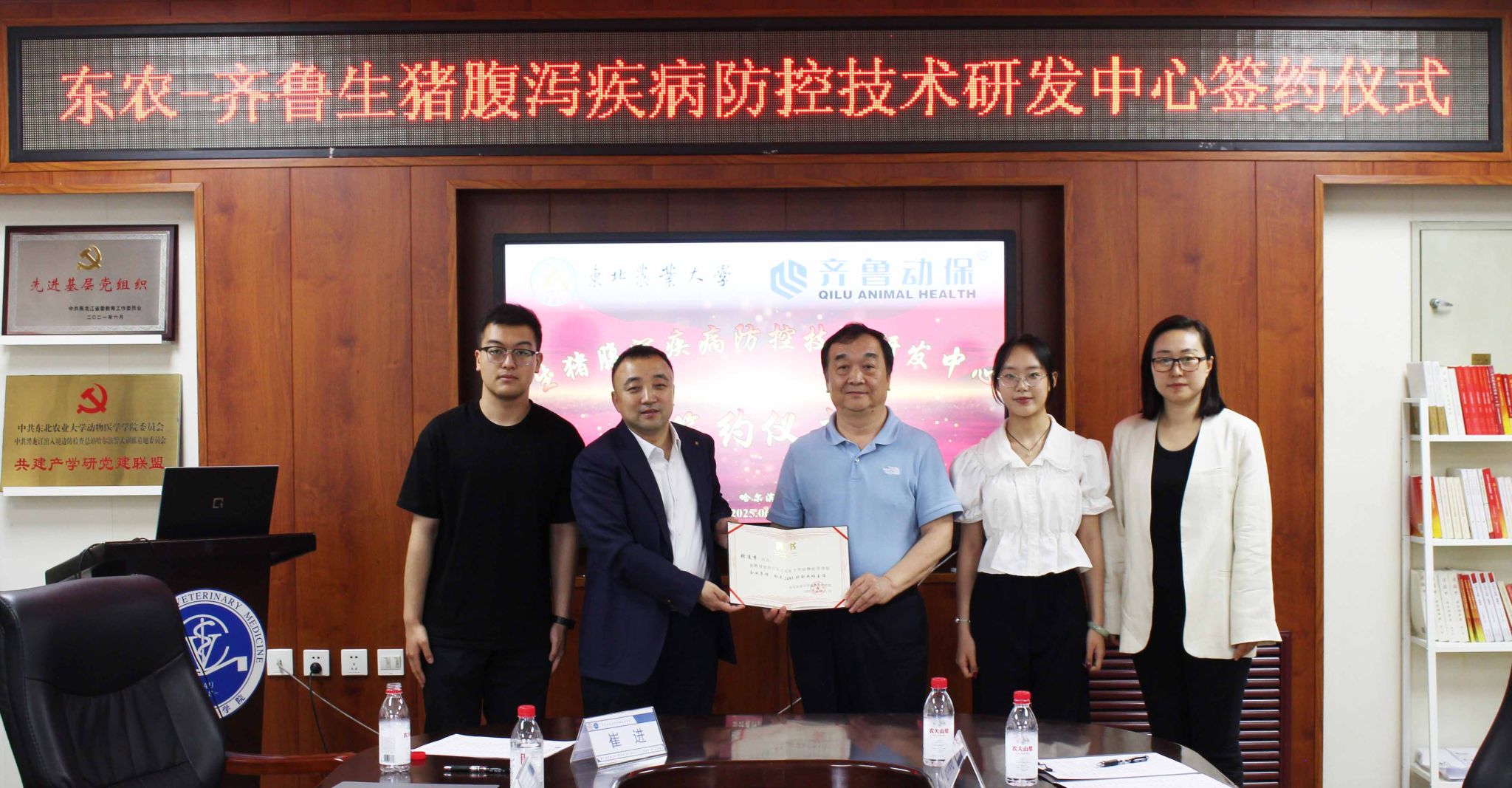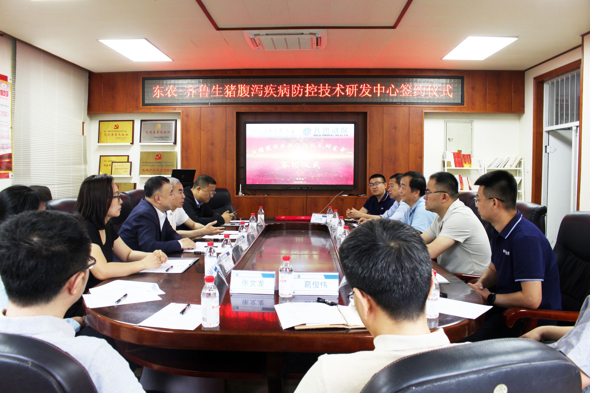 李金龙和宋晓飞代表合作双方签订《东农-齐鲁生猪腹泻疾病防控技术研发中心》协议书。