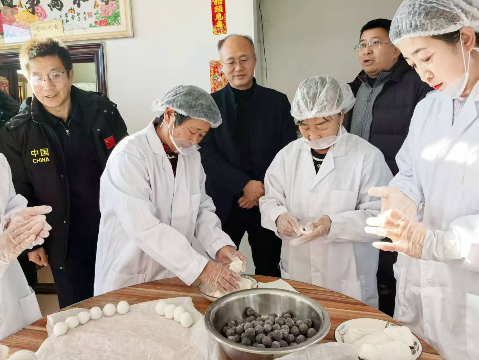 随后,一行人来到村会计程敬春家的粘豆包手工作坊。门一推开,白蒙蒙的蒸汽氤氲满屋,瞬间模糊了镜片。待水汽稍散,一个热火朝天的生产场景映入眼帘:近十位妇女围在宽大的案板前,动作麻利地揉面、包馅、塑形。她们大多是村里的留守妇女,如今在家门口就有了稳定的活计。
