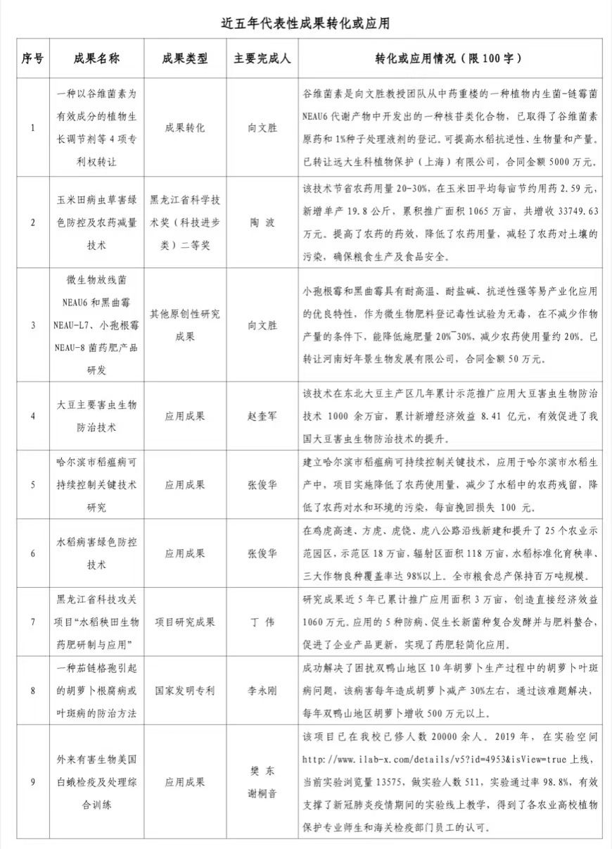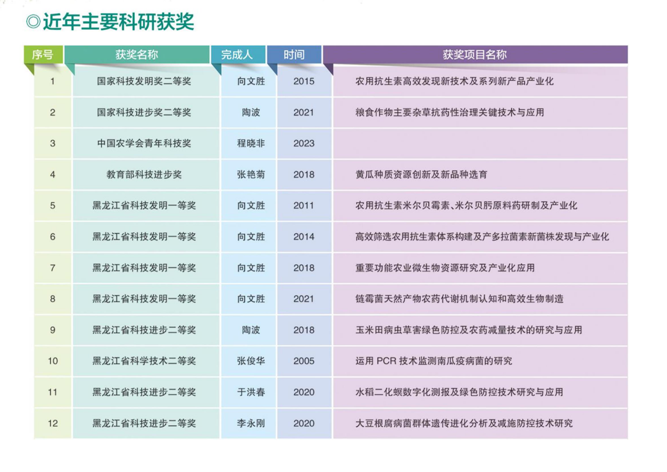 科研平台建设是促进学院内涵式发展的重要内容。学院围绕国家需求和区域特色,立足北方现代农业发展重大需求,以黑龙江省农业微生物重点实验室为依托,开展了新型农用抗生素的发现与生物合成调控,功能微生物的筛选及其重要功能基因的发掘与应用,有机废弃物发酵微生物代谢调控机制,丝状真菌表达系统的研究与应用等4个方向研究。获得微生物新种、新属200余个,新骨架、新结构活性化合物300余个,获得新药证书8个,多个农用功能活体微生物实现转让。以黑龙江省寒地作物有害生物绿色防控重点实验室为依托,围绕玉米、水稻、大豆、杂粮等作物有害生物发生及成灾规律、作物抗性资源筛选与利用、有害生物绿色防控技术开发,及有害生物监测预警信息系统建立等相关领域问题,开展了创新性基础和应用基础研究,满足我省有害生物绿色防控及发展绿色农业的重大需求。