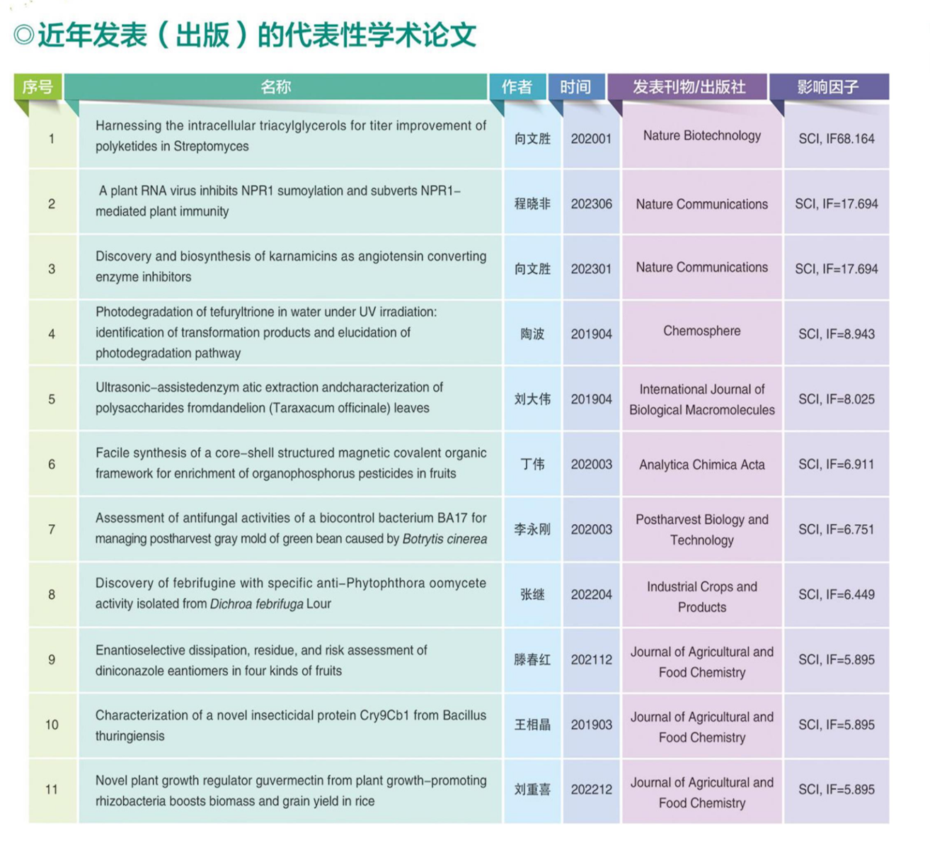 “十三五”以来,发表科研论文429篇,其中SCI收录论文104篇,中文核心34篇。获得省级以上学会、协会奖6项。为丰富植保领域知识宝库,增加植保领域知识积累,助力同时代和后代植保人继续攀登科学高峰做出贡献。