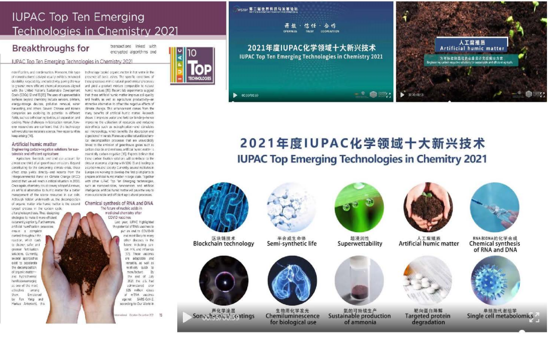 全球首次提出水热腐殖化技术,成功合成人工腐殖质。成果发表在Chemical Reviews(IF=72.087)等国际顶级期刊上,入选国际纯粹应用化学联合会(IUPAC)2021年度全球化学领域十大新兴技术,连续三年推广应用,作物全部实现增产增收。