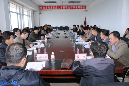 5月6日,由依安县农业局、林业局等33家企、事业单位代表组成的依安县科技合作共建考察团一行35人就加快科技成果转化、加强县校合作等事宜来我校进行对接洽谈。我校副校长郑秋鹛,新农村发展研究院副院长许修宏、朱志猛,农学院院长邹德堂,工程学院副院长周福君,动物科学技术学院副院长谢晓来,食品学院副院长李晓东,园艺学院副院长潘凯,资源与环境学院副院长姜佰文,水利学院副院长刘东,电气与信息学院副院长沈维政、动物医学专家赵树臣副教授参加会议。会议由许修宏主持。