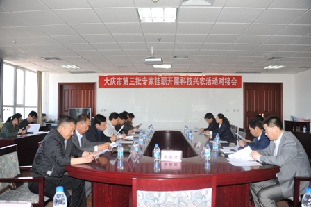 为进一步加强选聘高校、院所专家赴大庆市开展科技兴农活动,5月15日“第三批选聘高校院所专家到县区乡镇挂职开展科技兴农活动对接会”在大庆市政府大楼市委组织部会议室召开。大庆市委组织部人才办副主任杜金、市科技局副局长张喆、市农委纪检组长周德刚及省农科院大庆分院、黑龙江八一农垦大学相关部门负责人及挂职专家代表、大庆市所辖县区人才办主任及是人才办相关部门人员参加对接会。我校新农村发展研究院执行副院长孙占海、生命科学学院研究员岳奎忠、文法学院副教授于连平、园艺学院农艺师姜景彬参加对接会。对接会由大庆市人才办评审科科长秦明明主持。