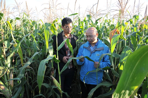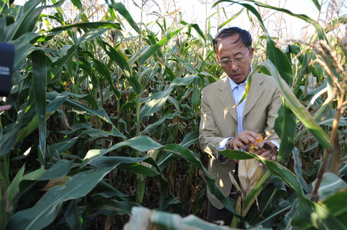 李卓夫教授在引进加拿大玉米新品种试验田采集数据