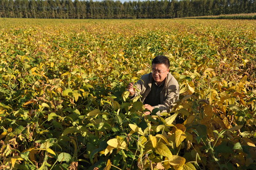 张大勇副研究员在东农59大豆新品种试验田采集数据
